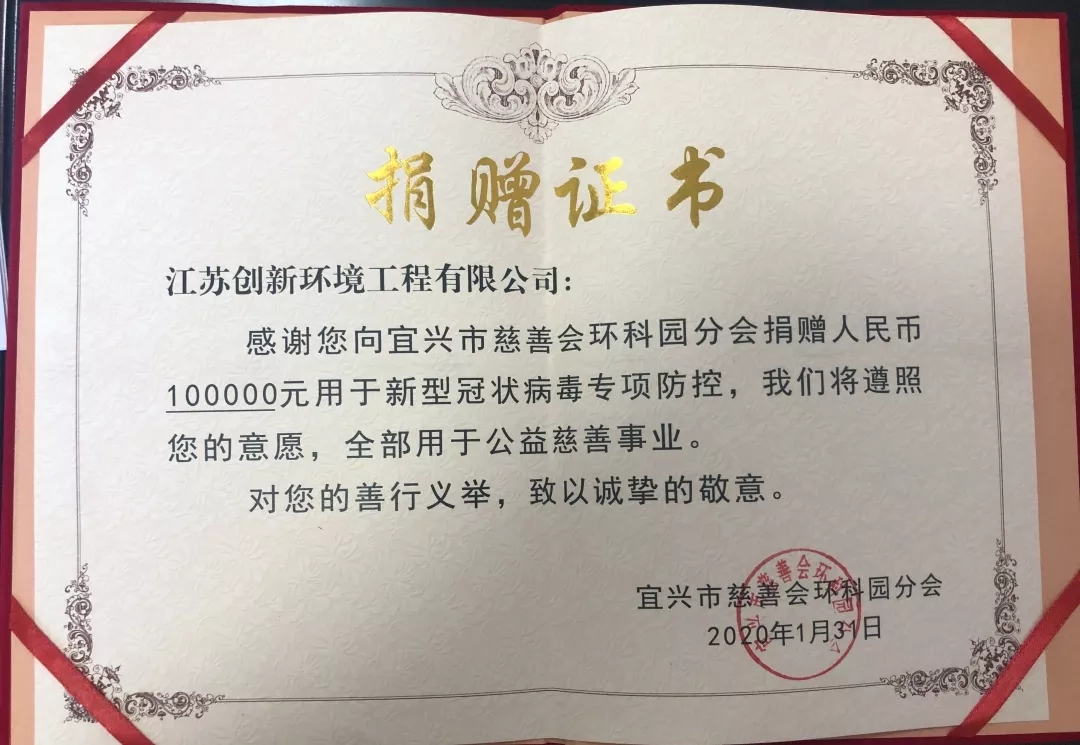 2020年,在抗擊“新型冠狀病毒感染肺炎”攻堅戰中,全國人民萬眾一心,眾志成城,共克時艱。在此非常時期,中國工業清洗協會的企業家成員們已經紛紛行動起來,用行動詮釋愛與責任,配合當地政府、慈善及醫療機構,貢獻自己的力量。江蘇創新環境工程有限公司1月30日向宜興市慈善會環科院分會捐款10萬元,用于疫情防控工作。