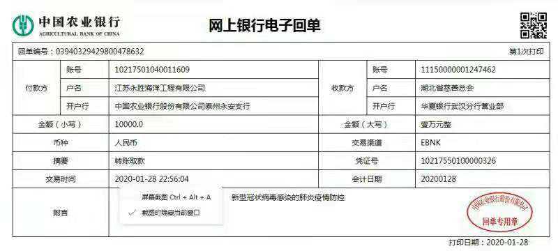江蘇永勝海洋工程有限公司向湖北省慈善總會捐贈1萬元,用于疫情防控工作。