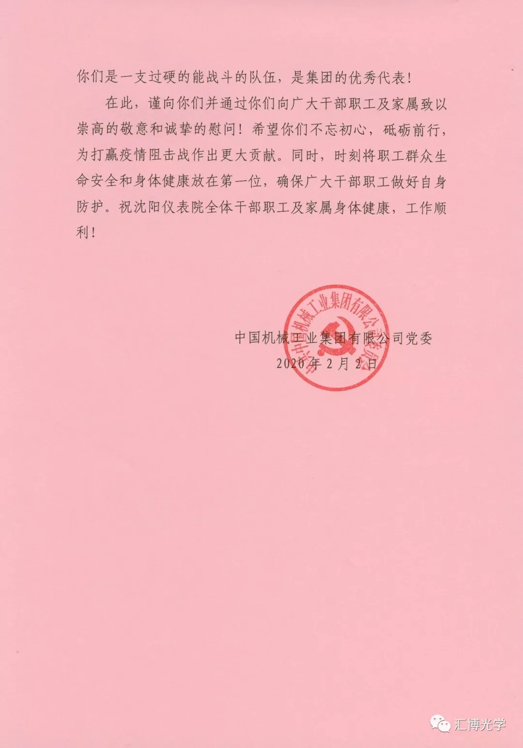 2月2日國機集團黨委向儀表院發來慰問信,向面對疫情危險,英勇無畏、團結一心,積極參與疫情防控行為的干部職工致以崇高的敬意和誠摯的問候。并鼓勵我們繼續開展新型冠狀病毒檢測設備用濾光片的研制、生產,科學防治、精準施策,為打贏疫情阻擊戰,做出更大的貢獻。