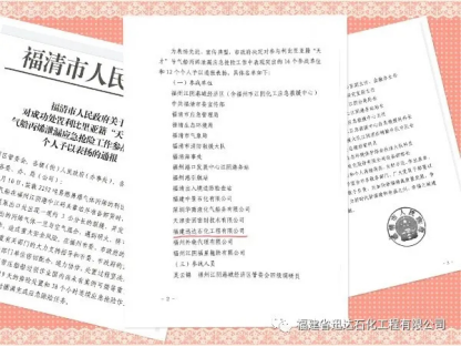 近日,福清市政府發(fā)布了“關于對成功處置利比亞籍‘天才’號汽船丙烯泄露應急搶險工作參戰(zhàn)單位和個人予以表揚的通報”,福建省迅達石化工程有限公司因為在處置汽船丙烯泄露應急搶險工作中的突出表現(xiàn),受到了書面表揚。